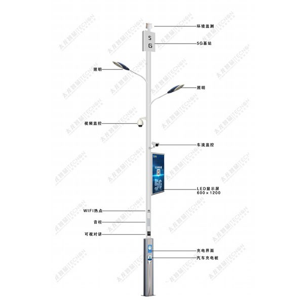 所謂智慧城市建設設備5G綜合桿就是傳統燈桿上集成多種功能設備,讓燈桿實現“一桿多用”,不在局限于單一的照明。比如說圖中展示:汽車充電樁、可視對講、WiFi熱點、信息發布屏(LED燈桿屏)、車流監控、視頻監控、主輔智能照明、5G基站以及各項環境檢測等,然后利用物聯網及互聯網技術實現智能化管理。讓普通燈桿升級為智慧城市信息采集的5G綜合桿、便民服務終端。
